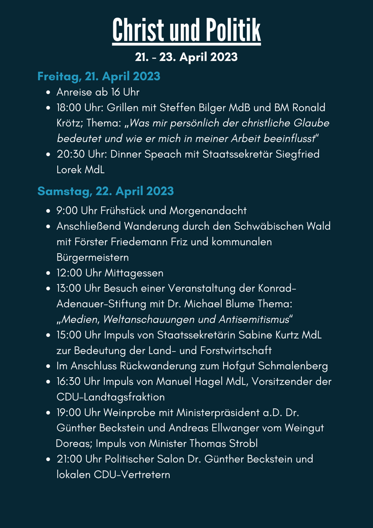 „Wie im letzten Jahr richtet sich unsere Veranstaltung an Menschen, die sowohl an Politik als auch am christlichen Glauben interessiert sind“, benennt Dr. Matthias Miller die Zielgruppe. „Erneut haben wir hierfür ein abwechslungsreiches Programm zusammenstellen können und dürfen uns auf die Teilnahme zahlreicher spannender Gäste freuen.“ So werden in diesem Jahr unter anderem der baden-württembergische Innenminister und stellvertretende Ministerpräsident Thomas Strobl, die Landtagsabgeordnete Sabine Kurtz MdL, die Unternehmerin Dr. Daniela Eberspächer-Roth, der ehemalige bayerische Ministerpräsident Dr. Günther Beckstein, der CDU-Fraktionsvorsitzende im baden-württembergischen Landtag Manuel Hagel MdL, der Antisemitismusbeauftragte der baden-württembergischen Landesregierung Dr. Michael Blume sowie Prälat Ralf Albrecht und Staatssekretär Siegfried Lorek MdL vor Ort sein und die Freizeit begleiten.