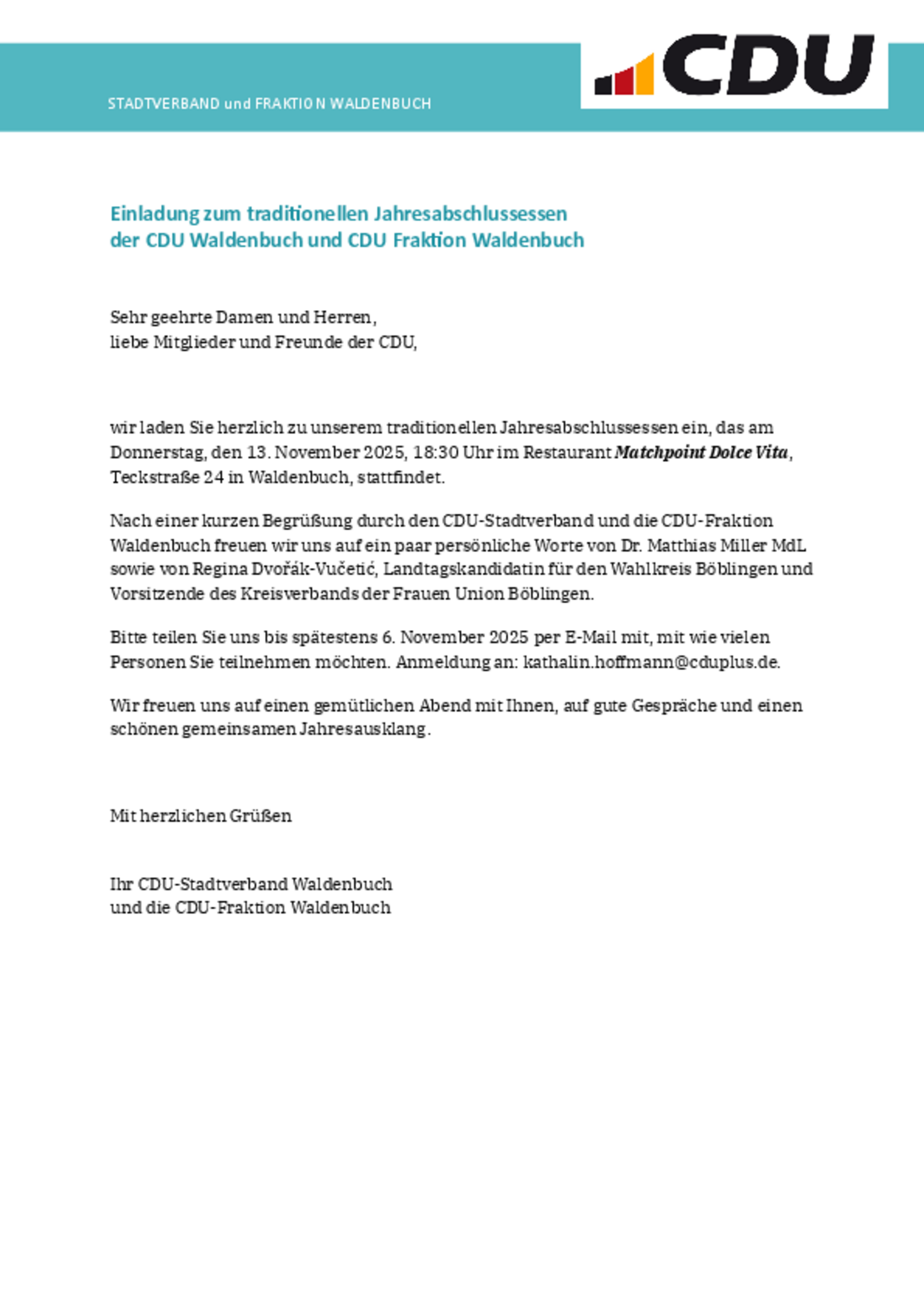 Einladung zum traditionellen Jahresabschlussessen der CDU Waldenbuch und CDU Fraktion Waldenbuch